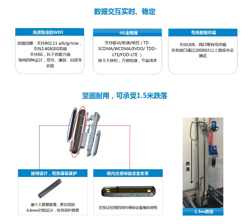 电源:可拆卸3.8V 4000mAh锂离子充电电池(支持电池内部电量计,内置3.7V 60mAh锂离子备份电池);侧面接口,标准Micro USB接口,支持快速充电,智能识别PC及充电器;底部接触式尾插接口,支持快速充电和USB数据通信,智能识别PC及充电器